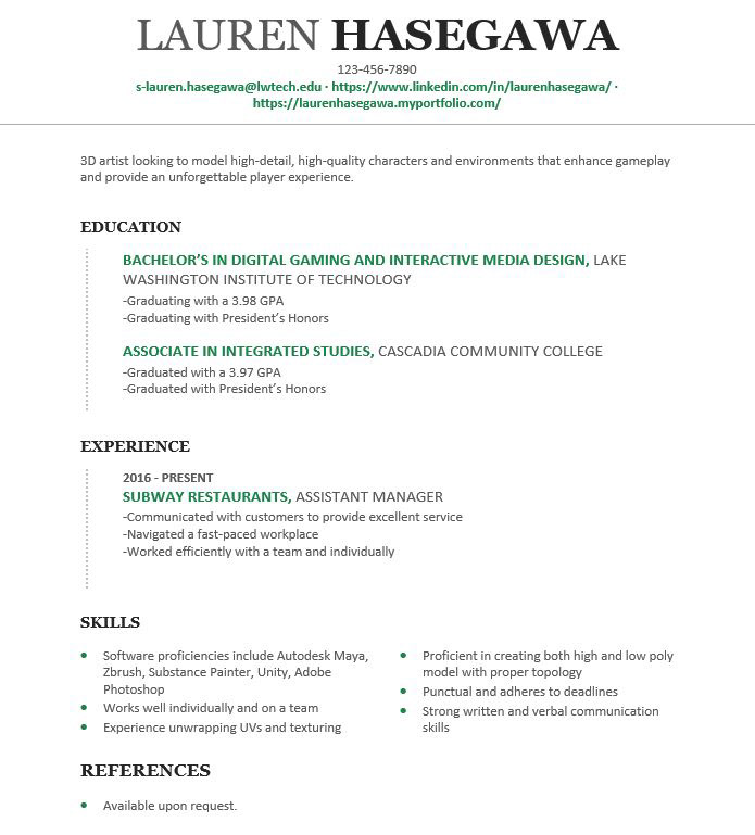 I will be completing my Bachelor's in Digital Gaming and Interactive Media Design at Lake Washington Institute of Technology in the spring of 2022. In 2019, I graduated with president's honors from Cascadia Community College with an Associates in Integrated Studies.
